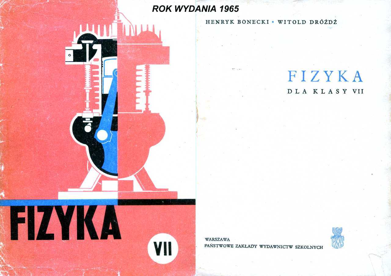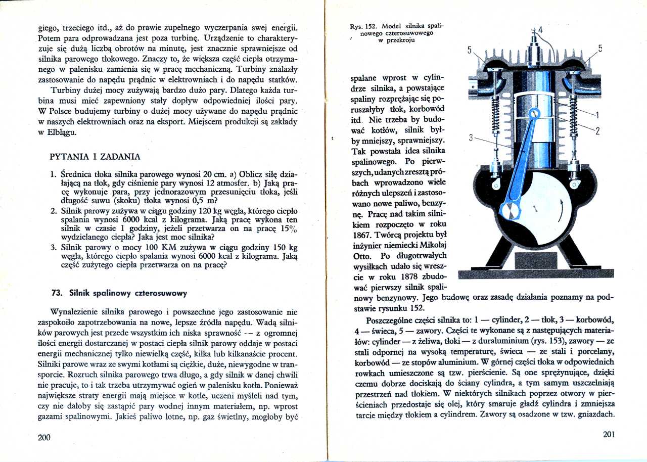 Fragment podręcznika fizyki dla klasy VII z roku 1965 (autorzy Henryk Bonecki i Witold Dróżdż, wyd. PZWS). Publikowana część zawiera opisy zagadnień związanych z maszynami cieplnymi w kontekście dostępnych pomocy naukowych (od maszyny parowej, poprzez silniki spalinowe, aż do silnika odrzutowego).