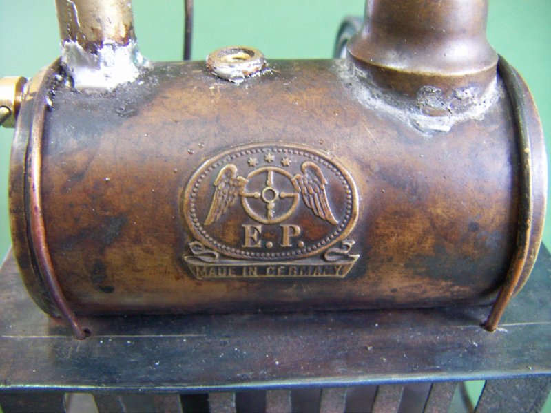 Pierwszy (E.P) z przed 1930r. Producent, firma E.P., przestała istnieć ok. 1930r. Niestety przez całą swoją historię używałą tego samego logo co uniemozliwia dokładne określenie daty powstania tego egzemplarza. Tym bardziej, że był to jeden z jej podstawowych modeli. Zapewne da się określić rok budowy po detalach, ale do tego potrzeba eksperta od starych zabawek ;). Średnica koła zamachowego: ~6cm.