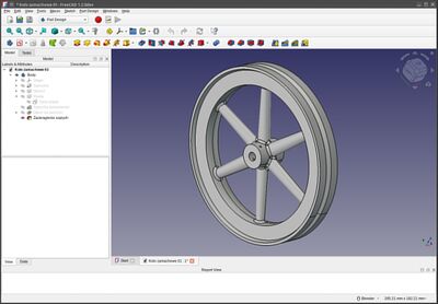 Moduł "Part design". Tu jako przykład prezentujemy koło zamachowe od "szkolnej maszyny parowej".