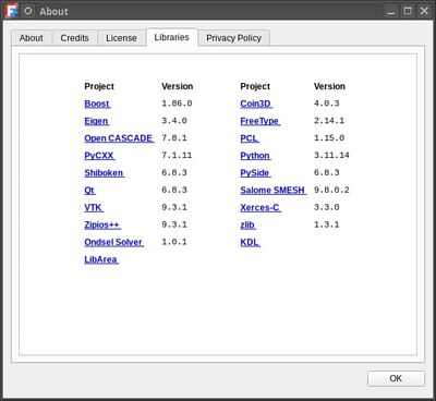 FreeCAD to nie tylko duże ilości własnego kodu i OpenCASCADE. To również znaczna ilość innych dostępnych bibliotek i narzędzi. Jednak nie ma co się stresować. FreeCAD jest dystrybuowany jako kompletne oprogramowanie i nie wymaga doinstalowywania dodatkowych pakietów.