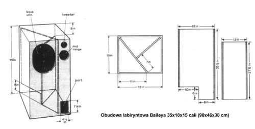 Po pierwsze głośnik niskotonowy w linii jest przez zwrotnicę odcinany stosunkowo nisko. W konstrukcjach na Kef B139 związane jest to z nietypową konstrukcją tegoż głośnika. Jak wiadomo za membranę robi tam klocek ze styropianu, co skutecznie niweluje zjawisko dzielenia się membrany sprzyjające propagacji tonów średnich. Dlatego częstotliwość podziału w PRO 9TL wynosi 460 Hz. Aby głośnik średniotonowy mógł podjąć pracę tak nisko musi mieć odpowiednią powierzchnię i zdolność do propagowania niskiego środka a to wiąże się z jego rozmiarami. Oczywiście jeśli głośnik dobrze gra w regionie niskiego środka niekoniecznie musi tak czynić w zakresie wysokiego środka. Dlatego głośnik użyty w PRO 9TL też jest podzielony stosunkowo nisko bo 3,4 KHz To z kolei narzuca wymagania na wysokotonowy... Może się więc okazać, że ni stąd ni z owąd kolumna zrobi się czterodrożna... Skomplikuje to co prawda zwtronicę, ale uwolni nas od wielu ograniczeń zwłaszcza w dziedzinie odtwarzania tonów średnich. Po drugie umieszczenie głośników trzeba jednak dobrze przemyśleć. Głośniki średniotonowe muszą być osłonięte od tyły, a to może dość ograniczyć przekrój końcowego fragmentu kanału. Oczywiście można w kolumnie nadbudować nad zasadniczą częścią labiryntu komorę na głośnik (głośniki średniotonowe, ale to zwiększy wydatnie gabaryty i tak już dużej konstrukcji. Jak wynika z dotychczas opisanych wariantów wymiary kolumny zależą oczywiście od zastosowanego głośnika niskotonowego. W końcu to jego gabaryty przede wszystkim powierzchnia jest parametrem narzucającym przekrój labiryntu. Pozostałe głośniki też mają wpływ jeśli trzeba je będzie osłonić od tyłu zgodnie z regułami sztuki. Korzystając z gotowego rozwiązania DIY powinniśmy zastosować 1:1 takie same głośniki, co czasem jest problematyczne ponieważ opisywane konstrukcje są już mocno wiekowe, a czasami tylko kosztowne, bowiem głośniki o udanych konstrukcjach są zwyczajnie "w cenie", czego najlepszym przykładem jest Kef B110. (kto w praktyce używał lub budowaał kolumny na tym głośniku dobrze wie dlaczego) Przykładem takiej trochę bardziej skomplikowanej linii jest nieco inna konstrukcja Chrisa Rogersa opisana w Hi Fi answers w roku 1975.