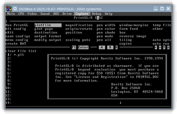 Ten emulator plotera nosił nazwę PrtGl, wersja 1.52. To był czysto DOSowy program z minionej epoki. Jednak potrafił zrobić wszystko co trzeba samoczynnie. Tzn. wczytać sobie plik przeznaczony dla ploterów w HPGL (czyli plt), podzielić duży format na małe arkusze, dojść do porozumienia z grubościami linii i wszystko ładnie wydrukować, bez potrzeby ciągłego nadzoru.