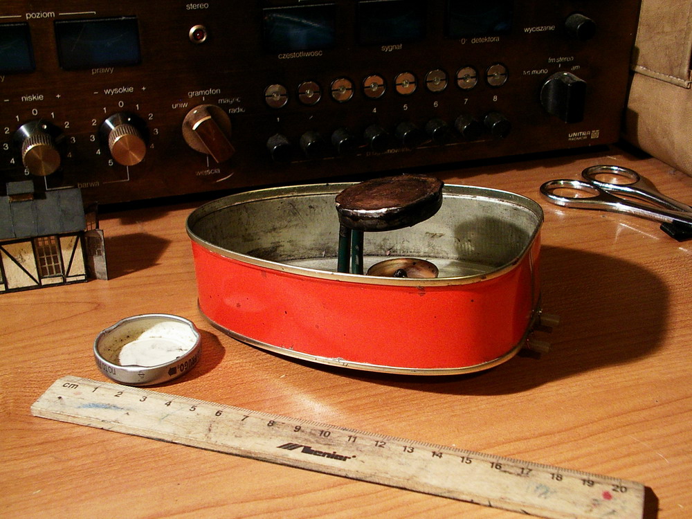"Silnik" mojej łódeczki zrobiony jest z zakrętki od szklanej butelki po skoku (średnica 42 mm x 10 mm wysokość). Przykryty jest miedzianą blaszką 0.08 mm. Od zakrętki w dół odchodzą dwie stalowe rurki (średnica zewnętrzna ok 5 mm) z przewodów hamulcowych od mojej Lancii. Wszystko łączone miękkim lutem. Pod kadłubem stalowe rurki przechodzą w gumowe wężyki, wyginając je można zmieniać kierunek płynięcia.