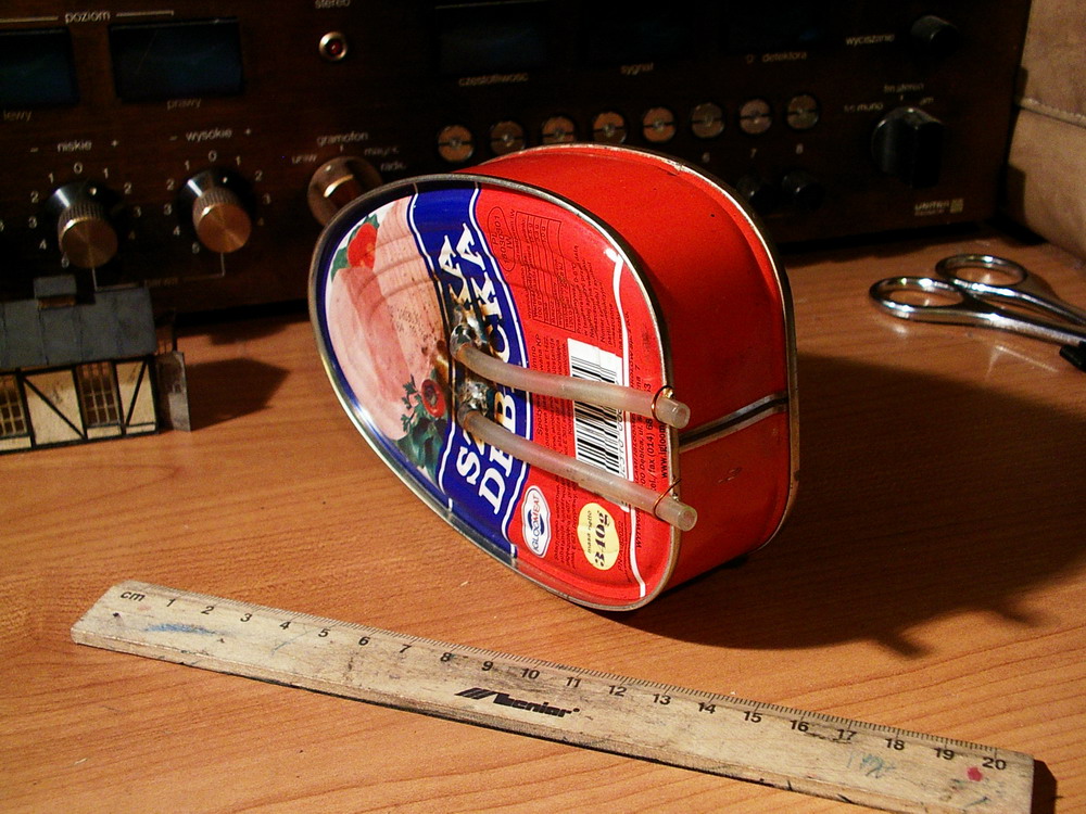 "Silnik" mojej łódeczki zrobiony jest z zakrętki od szklanej butelki po skoku (średnica 42 mm x 10 mm wysokość). Przykryty jest miedzianą blaszką 0.08 mm. Od zakrętki w dół odchodzą dwie stalowe rurki (średnica zewnętrzna ok 5 mm) z przewodów hamulcowych od mojej Lancii. Wszystko łączone miękkim lutem. Pod kadłubem stalowe rurki przechodzą w gumowe wężyki, wyginając je można zmieniać kierunek płynięcia.