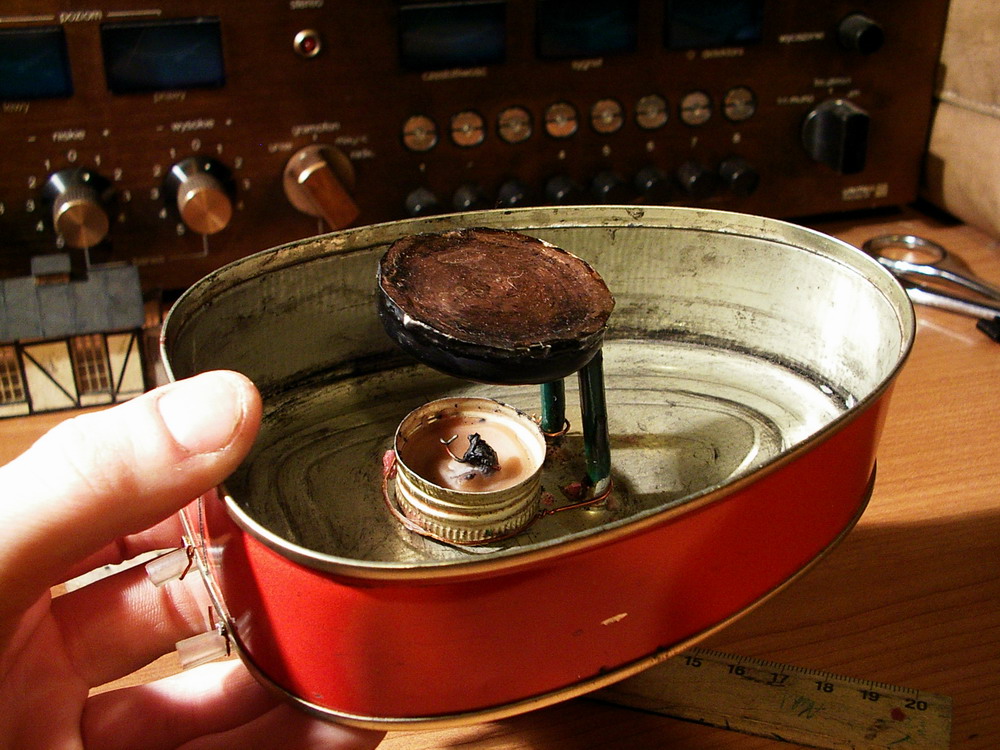 W dzieciństwie miałem łódkę odrzutową, która miała spory kociołek i rurkę wyrzucającą parę za rufę. Zasilana była z trójknotowej lampki. Pływała i bulgotała jak szatan, tylko trzeba było często gasić płomień, czekać aż wystygnie i dolewać wody, bo jak by cała woda wyparowała, to luty mogłyby puścić.