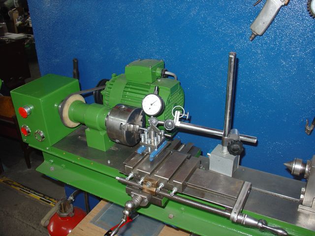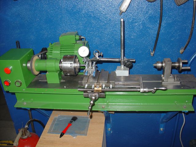 Istotnie, jest to samoróbka. Część pochodzi z fabrycznej obrabiarki. Wrzeciono jest inwencją poprzedniego właściciela, niestety jest zbyt wiotkie i łatwo wpada w drgania. Łoże jest produkcji własnej, wykonane z 20mm stalowej płyty, poddanej planowaniu. Do łoża przykręcona jest konstrukcja z ceowników która nadaje sztywność całości.