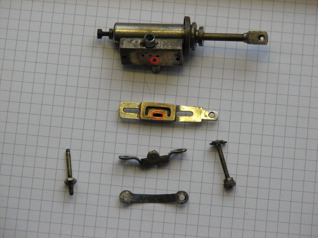 Wycięcie zakreślone na suwaku zapewne steruje wlotem pary do cylindra. Natomiast otwór zakreślony na cylindrze jest pewno wylotem pary poza silnik. Ew. odwrotnie, zaleznie od kierunku obrotu silnika.