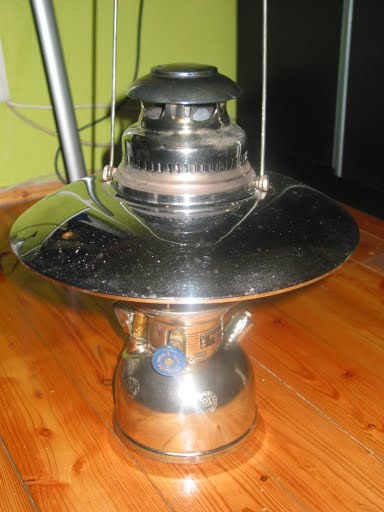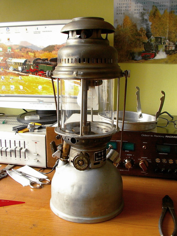 Niecałe dwa miesiące temu stałem się posiadaczem lampy wyjątkowej, którą jestem po prostu zachwycony! Jest to oryginalny wojskowy Petromax 829 B 500 HK. To moja pierwsza i jak dotąd jedyna naftowa lampa ciśnieniowa. Wcześniej znałem tego typu konstrukcje jedynie z internetu, bądź amerykańskich filmów -gdzie czasem pojawiają się mniej zaawansowane technicznie benzynowe Colemany (filmy wojenne, obozy skautów). Petromax jest lampą zgazowującą, czyli do palnika nie jest dostarczana ciekła nafta, lecz gaz powstały w wyniku jej zagotowania w zgazowywaczu -rurce okrążającej palnik, następnie lotna nafta jest rozpylana przez dyszę o odpowiednim przekroju i mieszana z zasysanym z zewnątrz powietrzem w mieszalniku -grubej wygiętej rurce znajdującej się ponad palnikiem. Mieszanina naftowo-powietrzna wpływa do ceramicznego palnika otoczonego koszulką/siatką Auera (lub z niemiecka -skarpetką Auera) gdzie ulega spalaniu emitując niezwykle silne światło (ok. 500 kandeli) i spore ilości ciepła. Zapalanie tej lampy nie jest takie proste jak zwykłej knotówki; najpierw trzeba w zbiorniku wytworzyć ciśnienie około 2 barów przy pomocy małej pompki (chyba, że napompowało się ją wcześniej, bo jest bardzo szczelna i dobrze trzyma ciśnienie), następnie trzeba dobrze rozgrzać zgazowywacz żeby wstępnie zagotować naftę. Jest to niezbędne, gdyż ciekła nafta wywołałaby "pożar" w lampie i zniszczyłaby siatkę Auera. Do podgrzewania zgazowywacza służy dodatkowy palnik tzw. rapid umieszczony nieco z boku -działa on na podobnej zasadzie co pistolet lakierniczy -rozpyla ciekłą naftę i sprężone powietrze, wytwarzając charakterystyczny szum przy spalaniu. Podgrzewanie trwa ok 90 sekund, po tym czasie można szybkim ruchem otworzyć dopływ nafty do głównego palnika, oraz zamknąć rapida, zmienia się dźwięk, siatka zaczyna jasno świecić -jeszcze przez chwilkę się rozgrzewa i światło osiąga pełną moc.