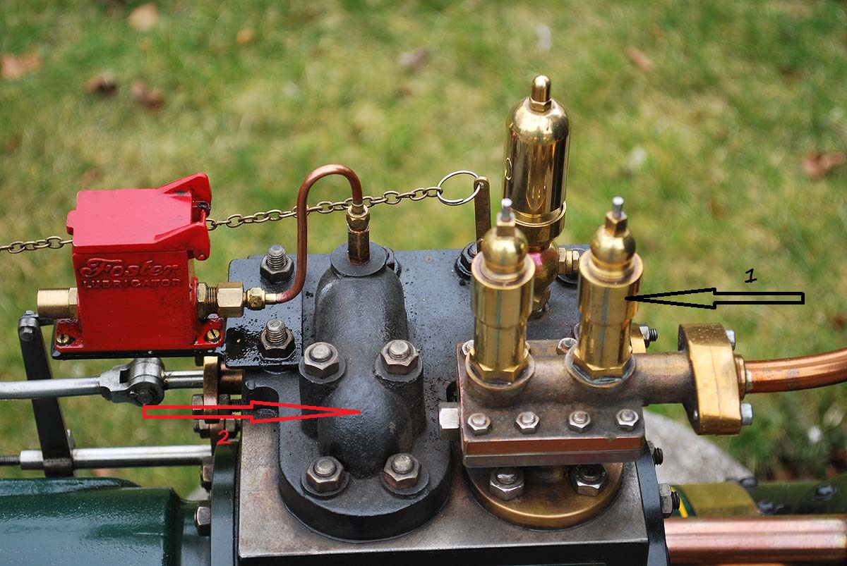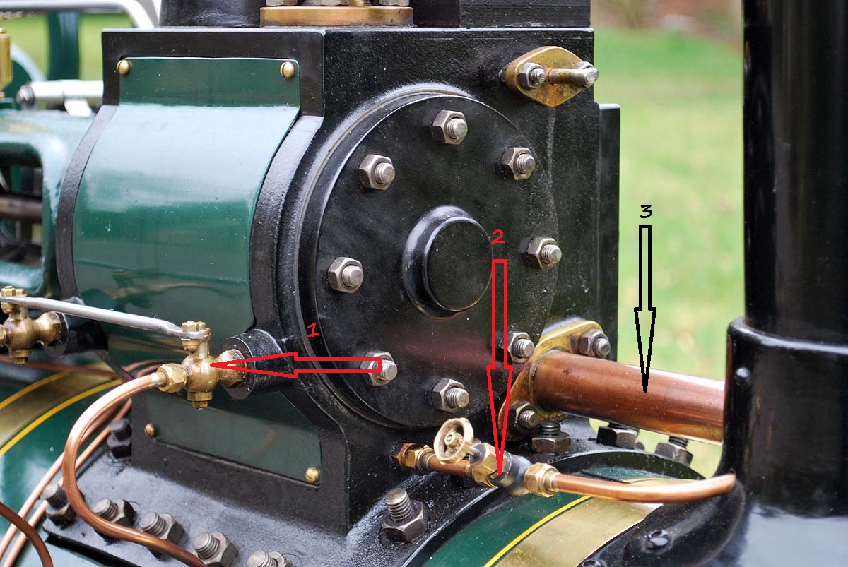 Mój błąd. Oczywiście chodziło mi, że wylotem pary na tym zdjęciu jest (3) (gruba rurka). Natomiast (1) są, tak jak kolega pisze, rurkami do spuszczania skroplin przy uruchamianiu silnika.