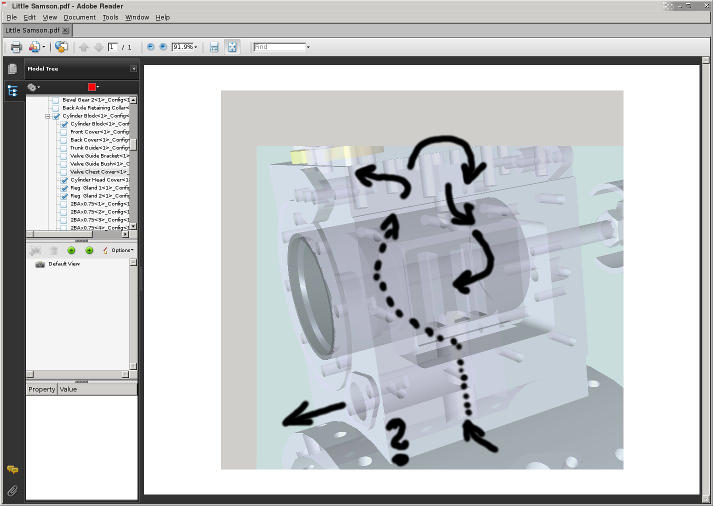 Gdzie jest wlot pary z kotła do silnika? Rysunek 3D ( http://www.littlesamson.co.uk/images/Little%20Samson.pdf ) (w Acrobat Readerze można go obracać i oglądać w trybie "półprzezroczystym") sugeruje, że wlot pary jest od dołu cylindra - bezpośrednio z kotła. Natomiast nie do końca można się zorientować jaki jest obieg pary w samym odlewie cylindra (brakuje szczegółów na modelu 3D...). Czyli znowu zgadujemy, dopóki nie znajdzie się dokładniejszych rysunków: Bezpośrednio z kotła para trafia do kanałów w odlewie cylindra. Tam się rozgałęzia na: zawór spustowy, zawór bezpieczeństwa, i "kolektor" (rura (2) ze zdj. 23). A dalej jak poprzednio - przepustnica, skrzynia zaworowa, cylinder, wylot.